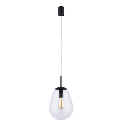 Modern pendant lamp with a stylish design from the series Pear, made of black colour steel base and pear-shaped clear glass diffuser. Interesting hanging lamp, suitable for lighting in your living room, dining room, bedroom, hotel and restaurant.