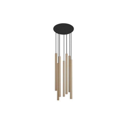 Modern pendant lamp with a stylish design, made of a round black steel base with seven satin brass colour diffusers in a cylindrical shape, suitable for lighting your living room, dining room, bedroom, hotel or restaurant.