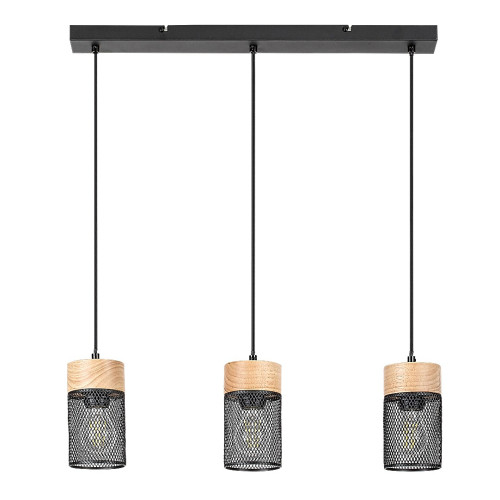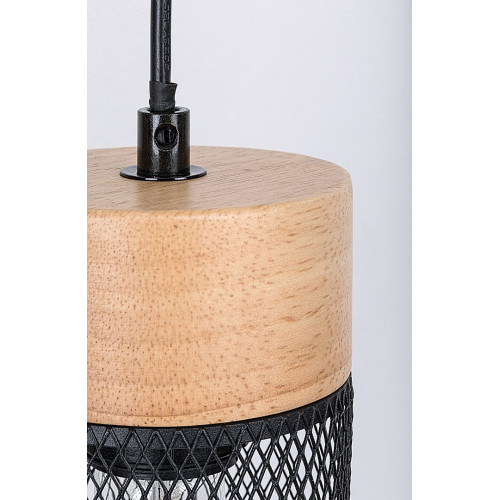 Original pendant lamp with an industrial design from the series Callum, made of a black colour rectangular metal base and three cylindrical shades of black metal mesh with decorative wooden elements in beech colour. Stylish proposal for comfortable lighting in your living room, dining room, hotel and restaurant.