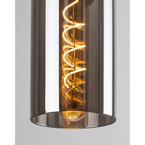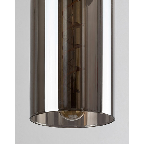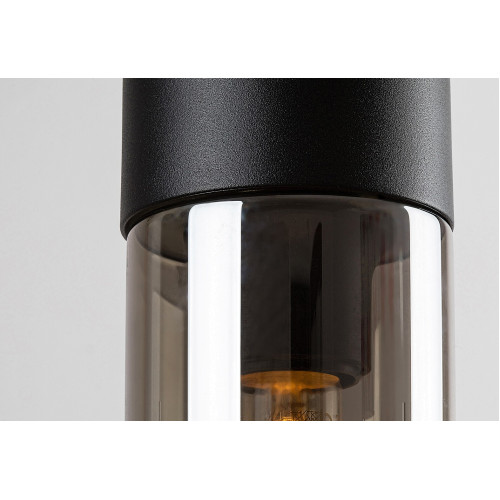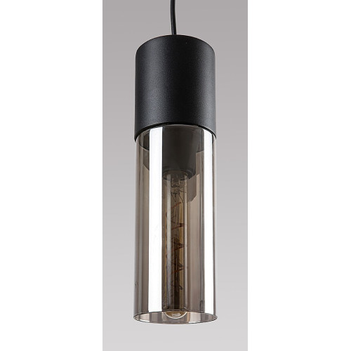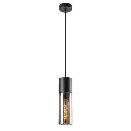 Elegant pendant lamp with a modern design from the series Ronno, made of a black colour metal base and transparent brown colour glass shade in a cylindrical shape. Hanging lamp, suitable for lighting in your living room, dining room, hotel and restaurant.
