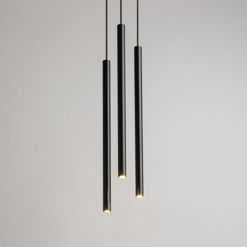 Stylish pendant lamp with a contemporary design, made of a round steel base and three cylindrical steel diffusers in black colour. Original lamp, suitable for lighting in your living room, dining room, bedroom, hotel and restaurant.