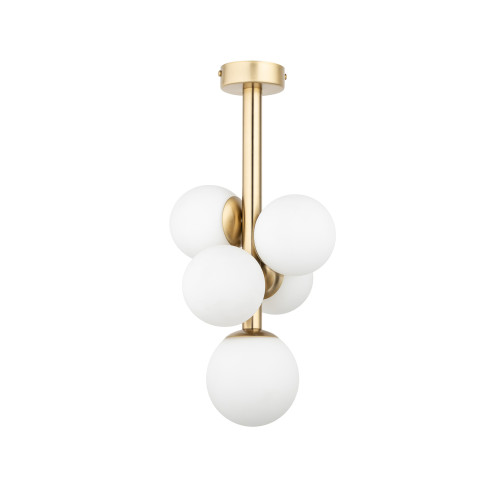 Modern pendant lamp with a stylish design from the series Perla Lux, made of a matt gold colour steel body and five white glass shades in a spherical shape. An excellent solution for comfortable lighting in your living room, dining room, bedroom, hotel and restaurant.