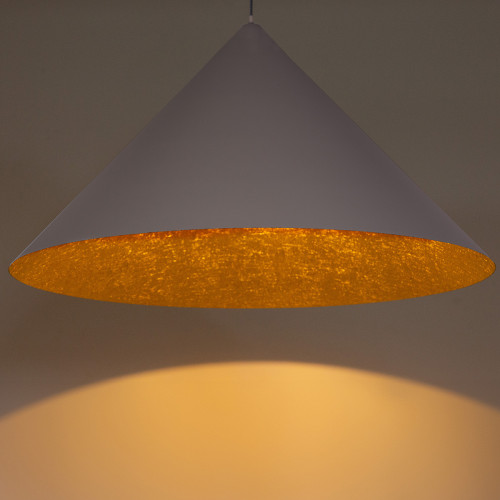 Elegant pendant lamp from the series Vesuvio, made of a taupe colour round steel base and a conical-shaped shade of mineral composite in taupe colour on the outside and gold colour on the inside. Modern hanging lamp that will fill with comfort and soft light your living room, dining room, bedroom, hotel and restaurant.