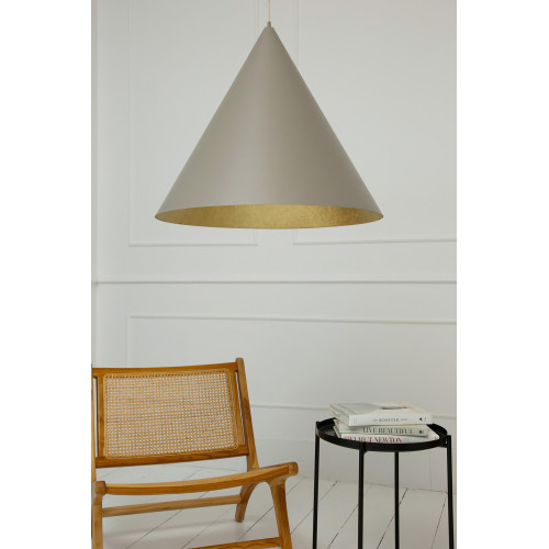 Elegant pendant lamp from the series Vesuvio, made of a taupe colour round steel base and a conical-shaped shade of mineral composite in taupe colour on the outside and gold colour on the inside. Modern hanging lamp that will fill with comfort and soft light your living room, dining room, bedroom, hotel and restaurant.