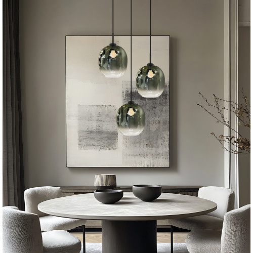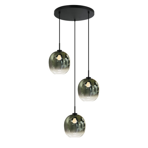 Elegant pendant lamp from the series Mirror, made of a black colour metal base and three oval-shaped shades of gradient mirror glass in an iridescent green to clear colour. Modern proposal for the interior lighting of your living room, dining room, bedroom, hotel and restaurant.