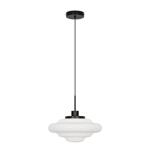 Stylish pendant lamp with a modern design from the series Elsa, made of a black colour metal base and an opal glass shade with an attractive shape. An original lamp, suitable for the comfortable lighting of your living room, dining room, bedroom, hotel and restaurant.