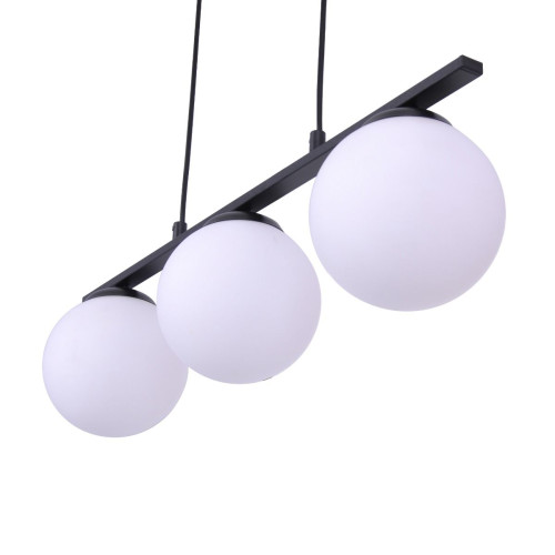 Modern pendant lamp with a stylish design from the series Globe, made of a black colour metal base and three white glass diffusers in a spherical shape. Quality lamp, suitable for comfortable lighting in your living room, dining room, bedroom, hotel or restaurant.