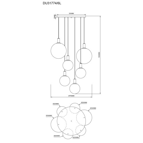 Dimensions: Height: 1500mm, Diameter: 750mm, Diameter of the shades: 2 x 300mm, 4 x 200mm