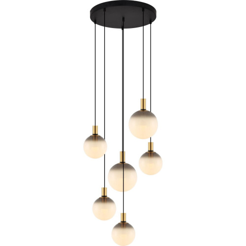 Original pendant lamp from the series Nua, made of a black metal base and six spherical glass shades in white colour with a slight smoked at the top and a gold decorative metal details. Stylish offer for comfortable lighting in your modern living room, dining room, bedroom, hotel and restaurant.