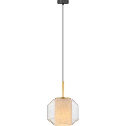 Stylish pendant lamp from the series Solix, made of a black metal base and cylindrical textile shade in beige colour, covered with octagonal transparent glass diffuser and gold decorative metal element. Modern solution for interior lighting of your living room, dining room, bedroom, hotel and restaurant.