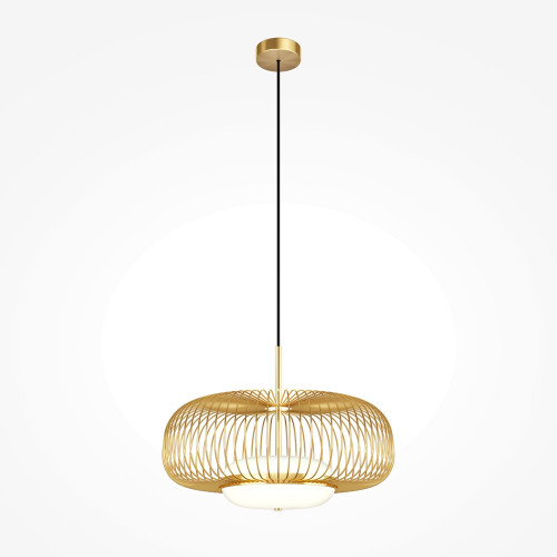 Stylish LED pendant lamp from the series Levitation, made of brass colour metal base and metal wire shade with white glass diffuser and built-in 20W LED, 3000K. Modern solution for the original lighting of your living room, dining room, bedroom, hotel or restaurant.