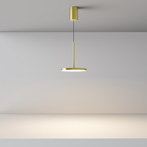 Modern LED pendant lamp from the series Plato, made of brass colour aluminium base and round flat aluminium body with built-in 12W, 3000K LED and light scattering angle: 120°. Stylish lamp with original design, suitable for lighting in your modern home, office, hotel and restaurant.