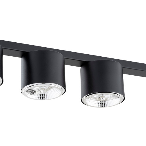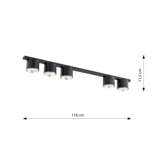 Modern ceiling lamp with a minimalist design from the series Nano, made of a black colour rectangular metal base and five metal heads in a cylindrical shape on a GU10 AR111 socket. Stylish proposal for the interior lighting of your living room, dining room, bedroom, hallway, office, hotel and restaurant.
