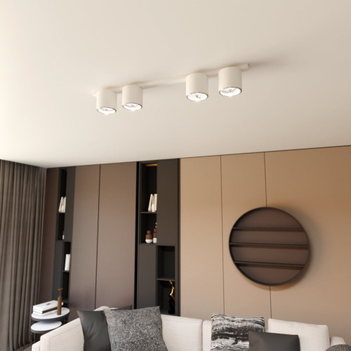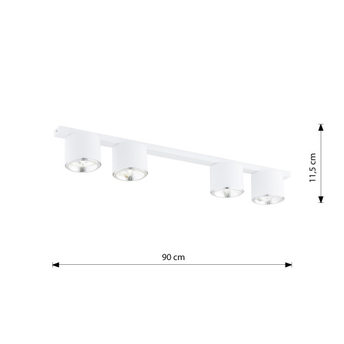 Modern ceiling lamp with a minimalist design from the series Nano, made of a white colour rectangular metal base and four metal heads in a cylindrical shape on a GU10 AR111 socket. Stylish proposal for the interior lighting of your living room, dining room, bedroom, hallway, office, hotel and restaurant.
