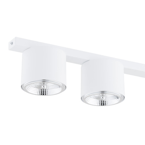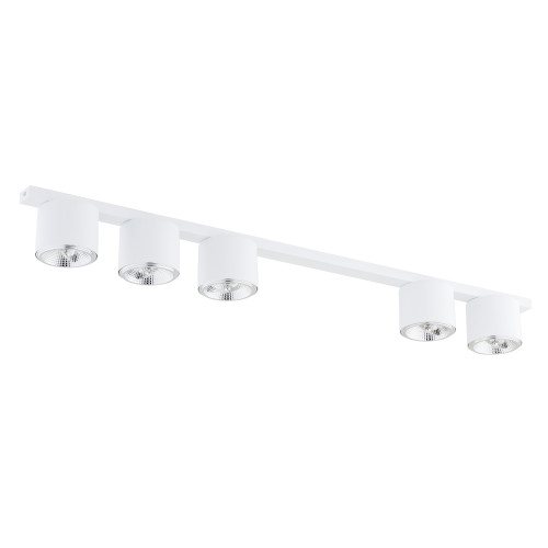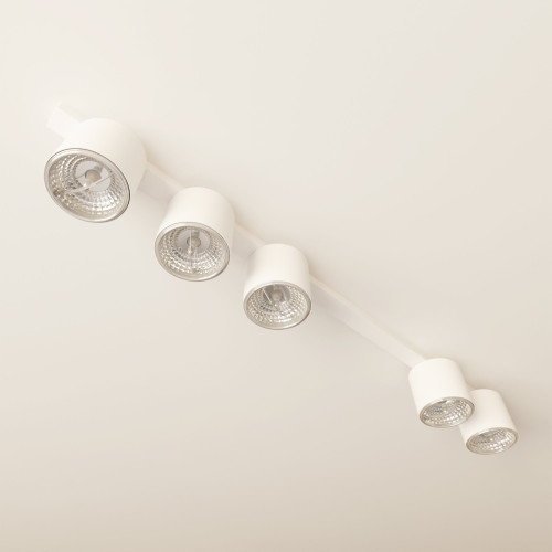 Modern ceiling lamp with a minimalist design from the series Nano, made of a white colour rectangular metal base and five metal heads in a cylindrical shape on a GU10 AR111 socket. Stylish proposal for the interior lighting of your living room, dining room, bedroom, hallway, office, hotel and restaurant.