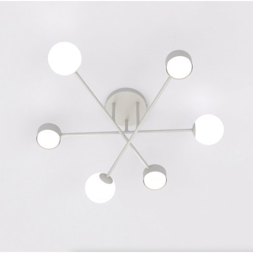Modern ceiling lamp with a functional design from the series Holon, made of a grey colour metal base and arms with three round metal heads on a GX53 socket and three opal glass shades in a spherical shape on a G9 socket. An original proposal for comfortable lighting in your living room, dining room, bedroom and hotel.