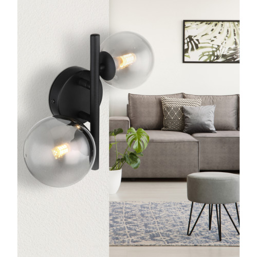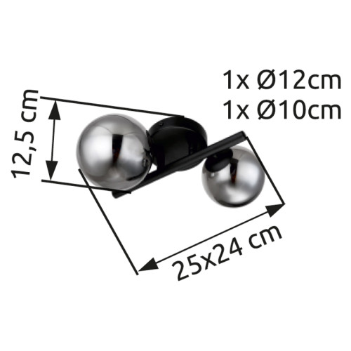Modern ceiling lamp with a stylish design from the series Riha, made of a black colour metal base and a metal arm with two spherical glass shades in smoked colour. An original proposal for comfortable lighting in your living room, dining room, bedroom, hotel and restaurant.
