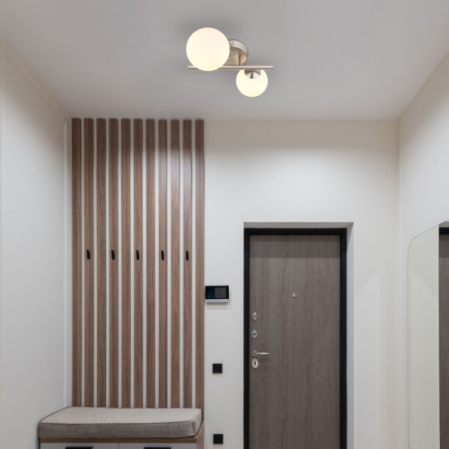 Modern ceiling lamp with a stylish design from the series Riha, made of a nickel matt colour metal base and a metal arm with two spherical glass shades in a white colour. An original proposal for comfortable lighting in your living room, dining room, bedroom, hotel and restaurant.