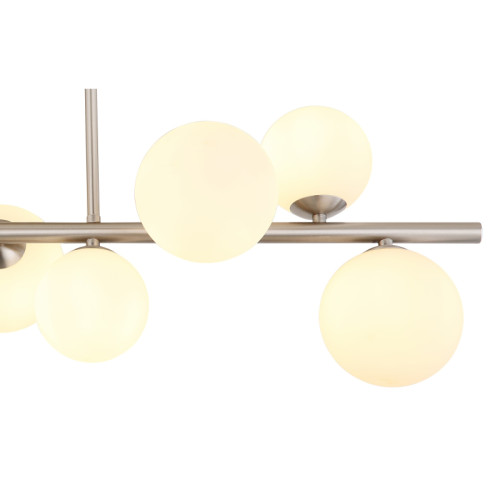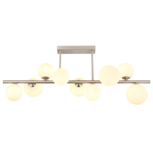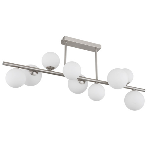 Modern ceiling lamp with a stylish design from the series Riha, made of a nickel matt colour metal base and a metal arm with nine spherical glass shades in white colour. An original proposal for comfortable lighting in your living room, dining room, bedroom, hotel and restaurant.