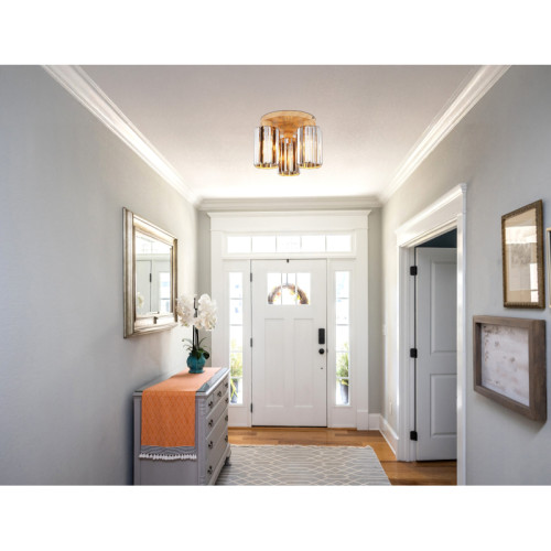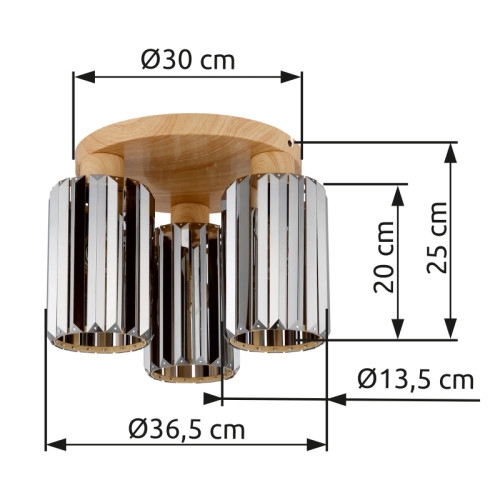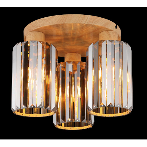 Stylish ceiling lamp from the series Run, made of a metal base imitating wood and three cylindrical shades of smoked crystals. Modern proposal for the comfortable lighting of your living room, dining room, bedroom, hotel and restaurant.