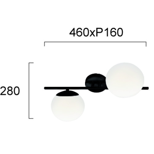 Stylish ceiling lamp with a modern design from the series Floris, made of black colour round metal base with arm and two white glass diffusers in a spherical shape. The lamp can also be mounted on a wall as a wall lamp. Great offer for lighting in your living room, dining room, bedroom, hallway, hotel and restaurant.