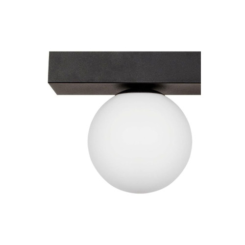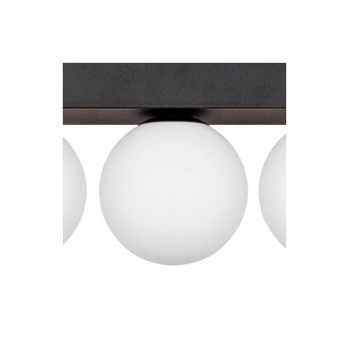 Modern ceiling lamp with an elegant design from the series Sphere, made of a black colour rectangular metal base and three white glass shades in a spherical shape. An original solution for lighting your living room, dining room, bedroom, hallway, hotel or restaurant.