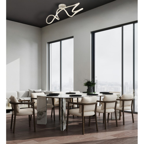 Stylish LED ceiling lamp from the series Swirl, made of a nickel matt colour metal base and an attractive curved aluminium body with a clear plastic diffuser and acrylic crystal decoration with a built-in 30W 4000K LED. An original proposal for the interior lighting of your living room, dining room, bedroom, hotel and restaurant.