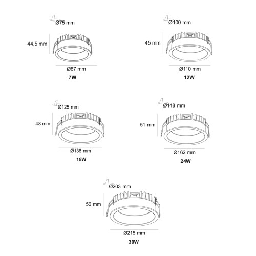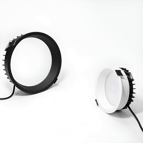 LED recessed downlight lamp with modern design from series Aura, made of black colour round aluminium body with deep inside prysmatic plastic diffuser and with integrate 18W CCT, Epistar LED, 1900lm, 3000K - 4000K or 6000K and Lifud driver. Effective lighting for any modern interior at your home, office, hotel and restaurant.