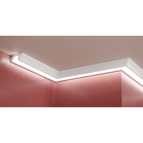 The LD-01.2 TOP LED lighting profile creates an extraordinary and innovative effect in the interior. It is made from XPS (fiber) or so-called extruded polystyrene foam. When clogging the XPS, a homogeneous foam is produced with microscopic closed air pockets, making it very light, sturdy and waterproof and very convenient for installation. There are several requirements for the installation: mounting on the wall is done with mounting adhesive (without solvent); plaster with gypsum glue between two profiles (about 5 cm); painting is mandatory - using water based paint or latex paint. It is recommended to mount an L-shaped aluminum profile in the channel in advance, the price being: 3.50 EUR. VAT / for 2 meters. The hidden lighting profile is available in 2m. , and the price on the site is for 2m. No LED bar included. The profile is suitable for lighting in your living room, dining room, bedroom, hotel and restaurant.