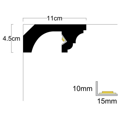 The LD-01 LED TOP lighting profile creates an extraordinary and innovative effect in the interior. It is made from XPS (fiber) or so-called extruded polystyrene foam. When clogging the XPS, a homogeneous foam is produced with microscopic closed air pockets, making it very light, sturdy and waterproof and very convenient for installation. There are several requirements for the installation: mounting on the wall is done with mounting adhesive (without solvent); plaster with gypsum glue between two profiles (about 5 cm); painting is mandatory - using water based paint or latex paint. It is recommended to mount an L-shaped aluminum profile in the channel in advance, the price being: 3.50 EUR VAT / 2 meters. The hidden lighting profile is available in 2m. No LED bar included. The profile is suitable for lighting in your living room, dining room, bedroom, hotel and restaurant.