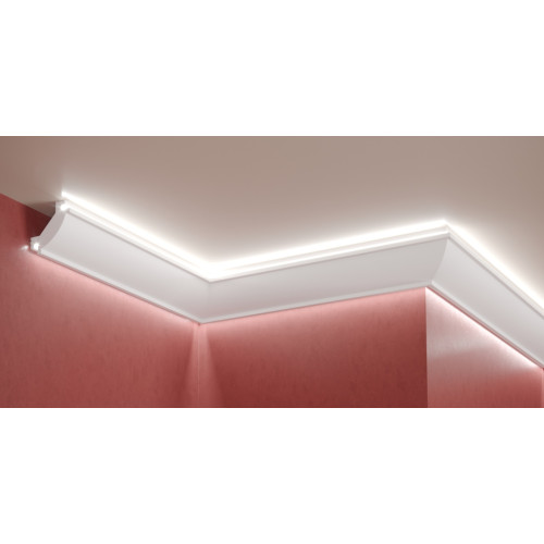 The LD-42 LED lighting profile creates an extraordinary and innovative effect in the interior. It is made from XPS (fiber) or so-called extruded polystyrene foam. When clogging the XPS, a homogeneous foam is produced with microscopic closed air pockets, making it very light, sturdy and waterproof and very convenient for installation. There are several requirements for the installation: mounting on the wall is done with mounting adhesive (without solvent); plaster with gypsum glue between two profiles (about 5 cm); painting is mandatory - using water based paint or latex paint. It is recommended to mount an L-shaped aluminum profile in the channel in advance, the price being: 3.50 EUR VAT / for 2 meters. The hidden lighting profile is available in 2m. , and the price on the site is for 2m. No LED bar included. The profile is suitable for lighting in your living room, dining room, bedroom, hotel and restaurant.