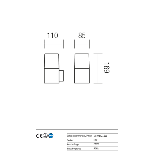 Dimensions: Heigth: 169mm, Width: 85mm; Distance from the wall: 110mm;
