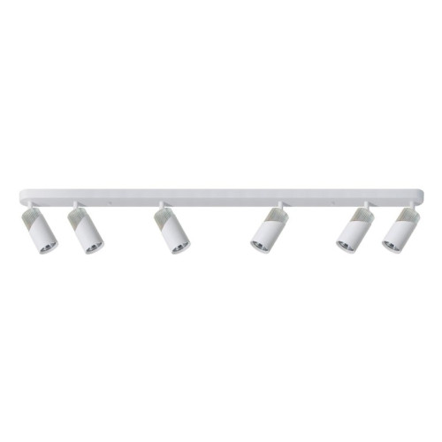 Stylish spot lamp from the series Neo, made of a white colour aluminium base with arm and six adjustable white cylindrical heads with chromed ribbing at the top of a GU10 socket. Original proposal for the modern and functional lighting of your living room, dining room, bedroom, corridor, office, hotel and restaurant.