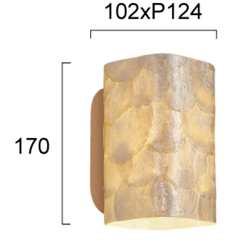 An original wall lamp with a stylish design, made of a matt gold colour metal base and a rectangular glass shade with rounded edges and a decorative coating of white seashells with double-sided light diffusion. Modern proposal for the interior lighting of your living room, dining room, bedroom, hallway, hotel and restaurant.