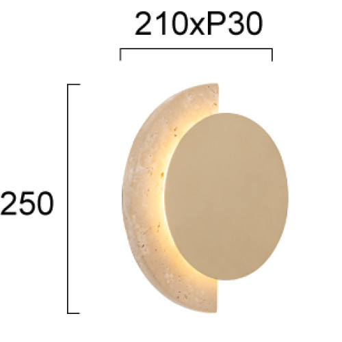 Original LED wall lamp from the series Miranda, made of a gold colour round metal body and a decorative semicircular detail of beige travertine with a built-in 13W, 3000K LED and indirect light distribution. Stylish lamp, suitable for modern and cozy lighting in your living room, dining room, bedroom, hallway, hotel and restaurant.