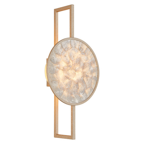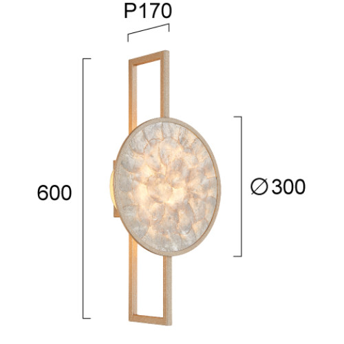 Attractive LED wall lamp with a contemporary design, made of antique brass colour rectangular metal base and round metal frame with white seashell and acrylic diffuser with built-in 8W, 3000K LED. Stylish lamp that will add uniqueness and cozy light to your living room, bedroom, hallway, office, hotel and restaurant.