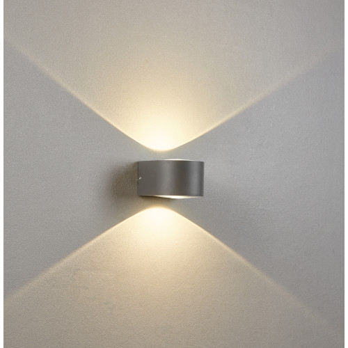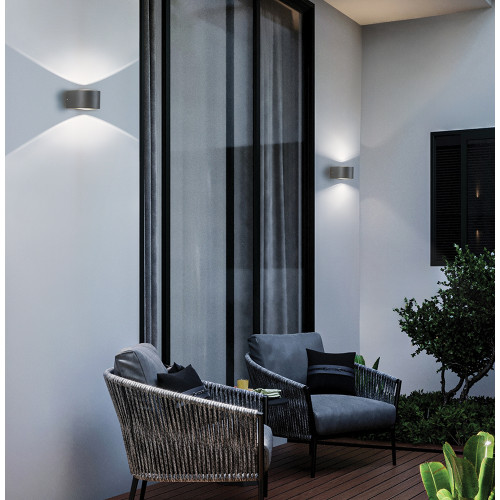 Stylish LED facade wall lamp from the series Mavenna, made of a dark grey colour aluminium body with a transparent tempered glass diffuser and a built-in 11W, 3000K LED with double-sided light distribution. Modern lamp with a high degree of ingress protection: IP54, suitable for comfortable lighting of the facade, entrance door, terrace and veranda in your home, villa, hotel and restaurant.