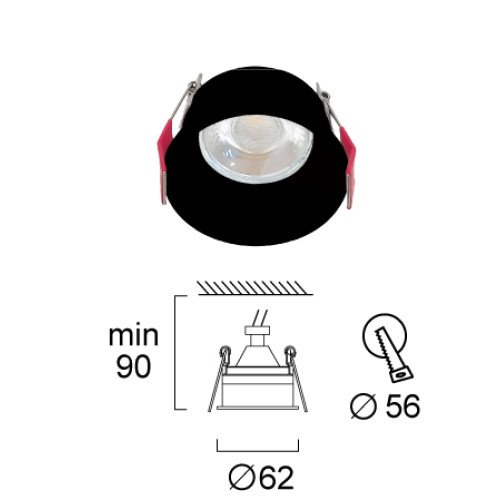 Dimensions: Diameter: 62mm, Depth: 90mm, Recessed diameter: 56mm