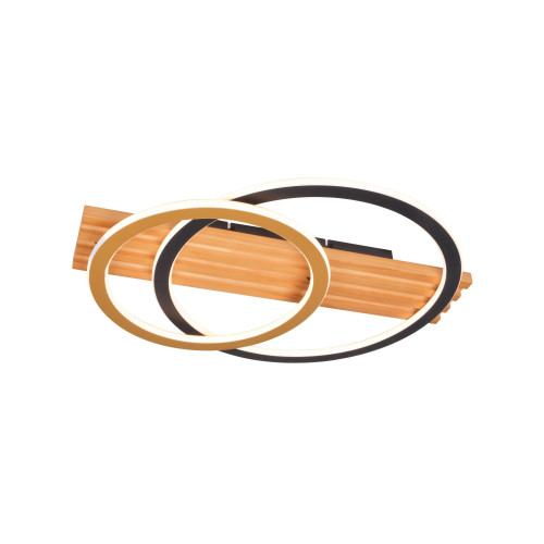 Original LED ceiling lamp, made of metal base with decorative natural wood panel and two metal rings in black and gold colour with white silicone diffusers and built-in 40W, 3000K LED. Modern solution for comfortable lighting in your living room, dining room, bedroom, hallway, hotel or restaurant.