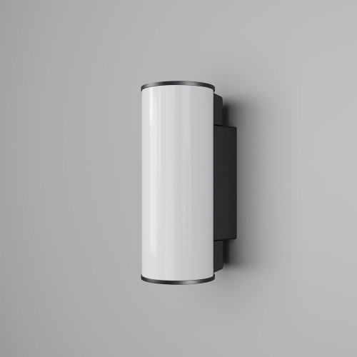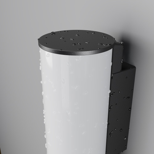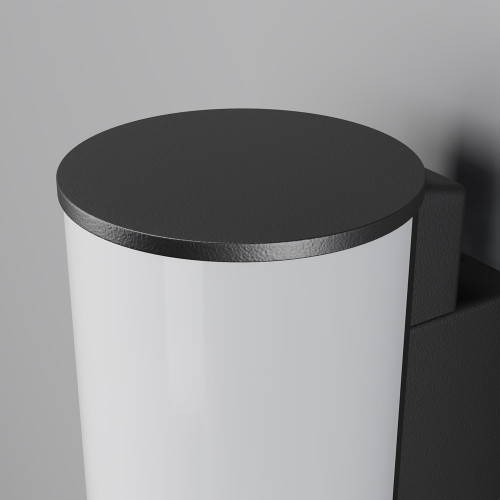 Стилен светодиоден фасаден аплик, изработен от цвят графит цилиндрично алуминиево тяло и бял пластмасов разсейвател с вграден 12W, 3000К LED. Модерна лампа с висока степен на влагозащита: IP54, подходяща за външното осветление на всяка фасада, веранда или тераса.