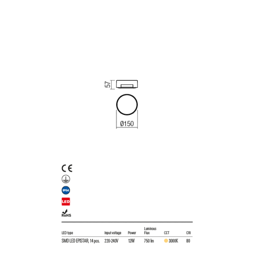 Максимална мощност: 12W, 3000K, 750lm, LED, CRI>80