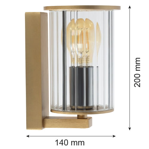 Стилен фасаден аплик от серията Norfolk, изработен от златист цвят алуминиева основа и прозрачна чашка от оребрено стъкло. Модерна лампа с висока степен на влагозащита: IP44, подходяща за качественото външно осветление на вашата фасада, веранда и тераса.