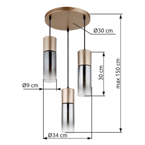 Стилен пендел от серията Annika, изработен от матово златист цвят метална основа и три цилиндрична форма опушени стъклени чашки. Модерно решение за комфортното осветление на вашия хол, трапезария, хотел и заведение.