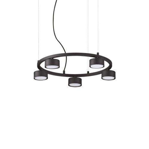 Съвременен пендел с оригинален дизайн от серията Minor, изработен от черен цвят метална основа с пръстеновидна рамка и пет кръгли метални чашки. Стилно предложение за осветлението във вашия хол, трапезария, спалня, офис, хотел и заведение.
