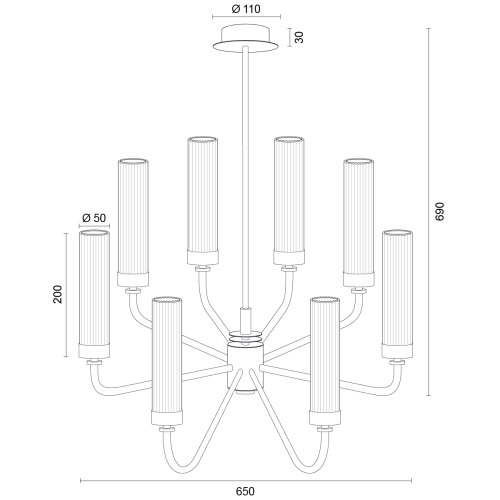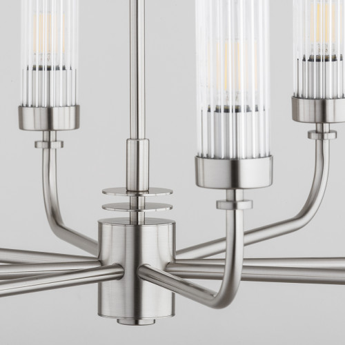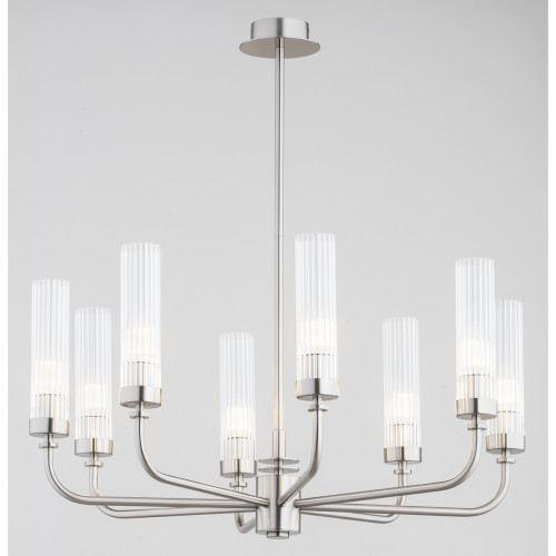 Великолепен полилей със стилен дизайн от серията Preston, изработен от матиран никел метална основа и метални рамена с осем прозрачни чашки от оребрено стъкло в цилиндрична форма. Класическа висяща лампа, подходяща комфортното и изискано осветление на вашия хол, трапезария, спалня, фоайе, хотел и заведение.