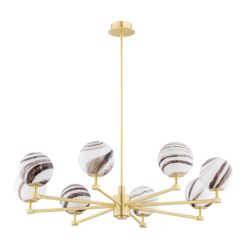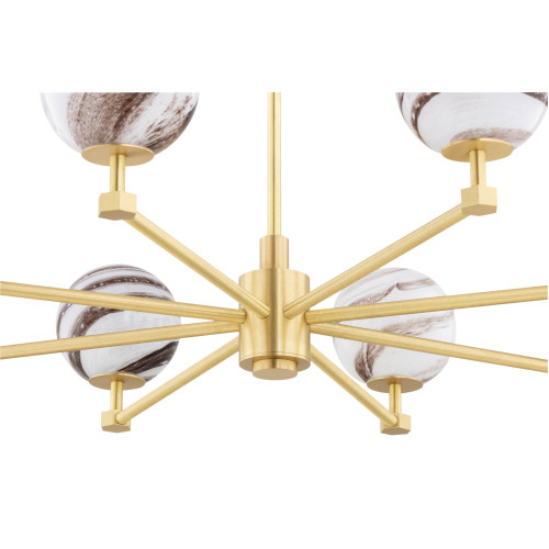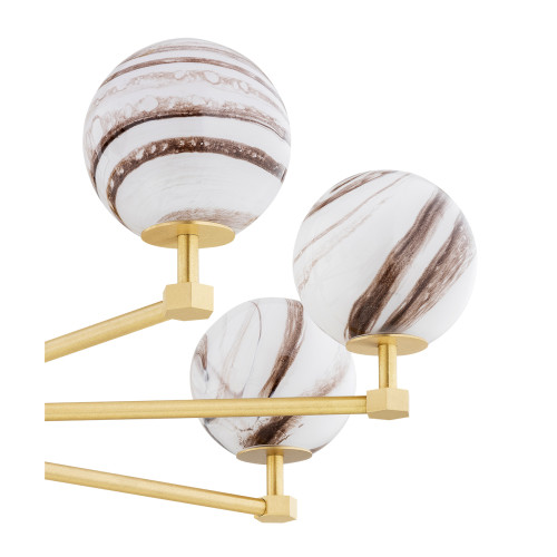 Стилен полилей с оригинален дизайн от серията Aruba, изработен от месингова основа с осем рамена и сферична форма стъклени чашки с бяло-кафява мраморна шарка. Модерно решение за комфортното осветление във вашия хол, трапезария, спалня, хотел и заведение.