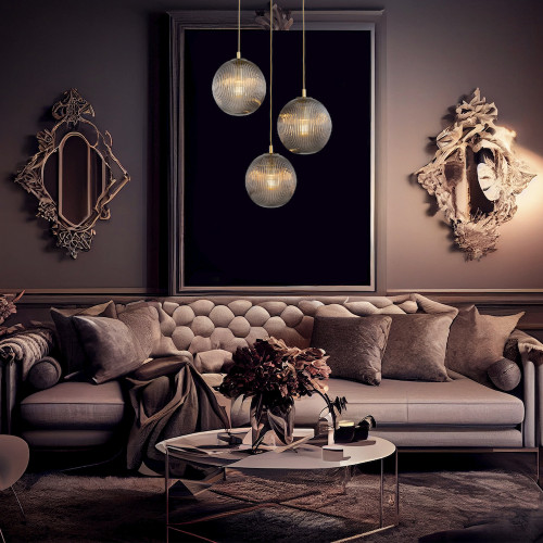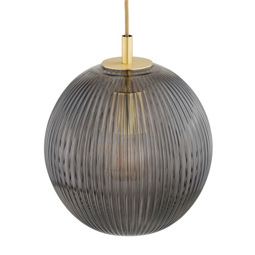 Стилен пендел от серията Paloma, изработен от кръгла месингова основа и висящи на различна височина три сферична форма чашки от опушено набраздено стъкло. Изискано предложение за качественото и комфортно осветление на вашия хол, трапезария, спалня, хотел и ресторант.