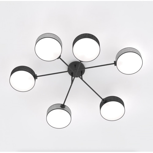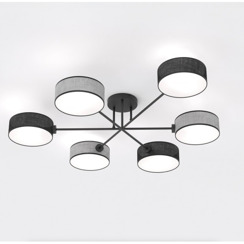 Стилен плафон с модерен дизайн от серията Maga, изработен от черен цвят метална основа и прави рамена с шест цилиндрична форма текстилни шапки в черен и сив цвят. Оригинално предложение за комфортното осветление във вашия хол, трапезария, спалня, хотел и заведение.