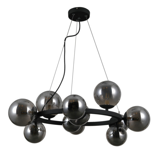 Елегантен пендел от серията Montora, изработен от черен мат цвят метална основа и кръгло рамо с единадесет опушен сив цвят сферични стъклени разсейвателя. Модерна висяща лампа, подходяща за стилното осветление във вашия хол, трапезария, спалня, хотел и заведение.