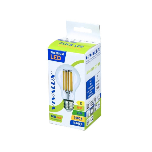 Светодиодна крушка A60 от серията Flick Premiun Led, изработена от прозрачен стъклен сферичен разсейвател с вграден 14W LED, 3000К, 2000lm на цокъл Е27, еквивалент по форма и визия на лампите с нажежаема жичка от 126W. Лампата е с удължен живот до 15000 часа и до 20000 включвания, ъгъл на разпространение: 360°.